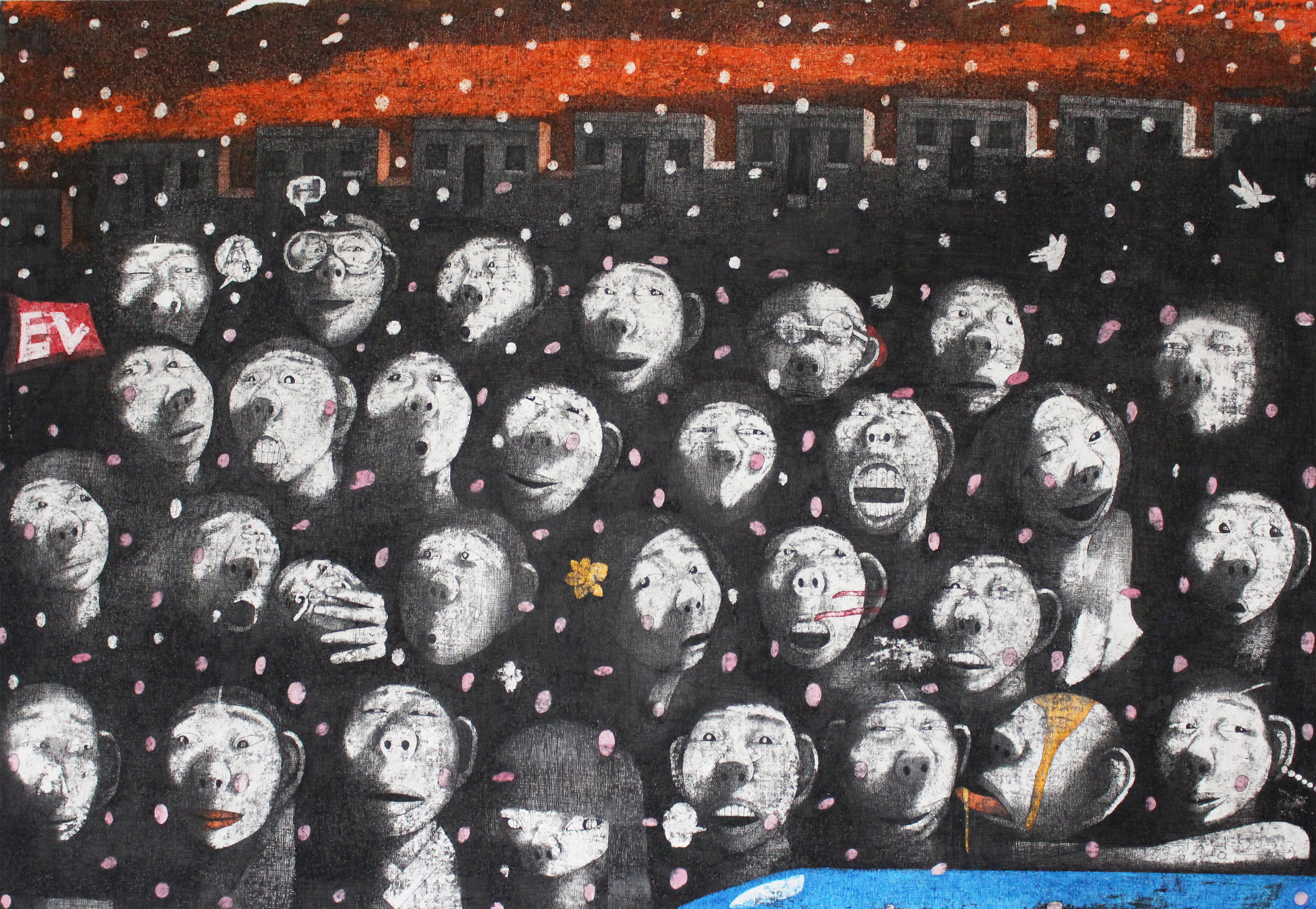 1980년대부터 장르의 경계를 허물며 지속한 다양한 매체 실험의 결실로서, 사회참여적 주제의식들이 평면에 펼쳐진다. 종이 위에 펜으로 무수한 선을 그리고 지우는 방식으로 생로병사의 고뇌와 희노애락의 사유하는 인간들의 모습과 그 세상을 담는 작가 신영성은 자신의 그림에 대해 인간이 건지려 하는 ‘호수 속의 달’을 그린 것이라고 말한다.